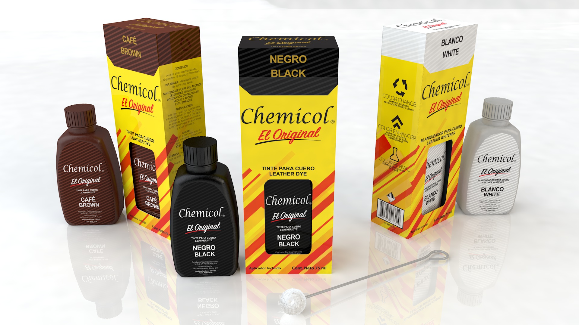 Tinte de alto cubrimiento para teñir el color de las prendas de piel o cuero con una formula elaborada con resinas repelentes al agua creando una capa protectora para el cuero.